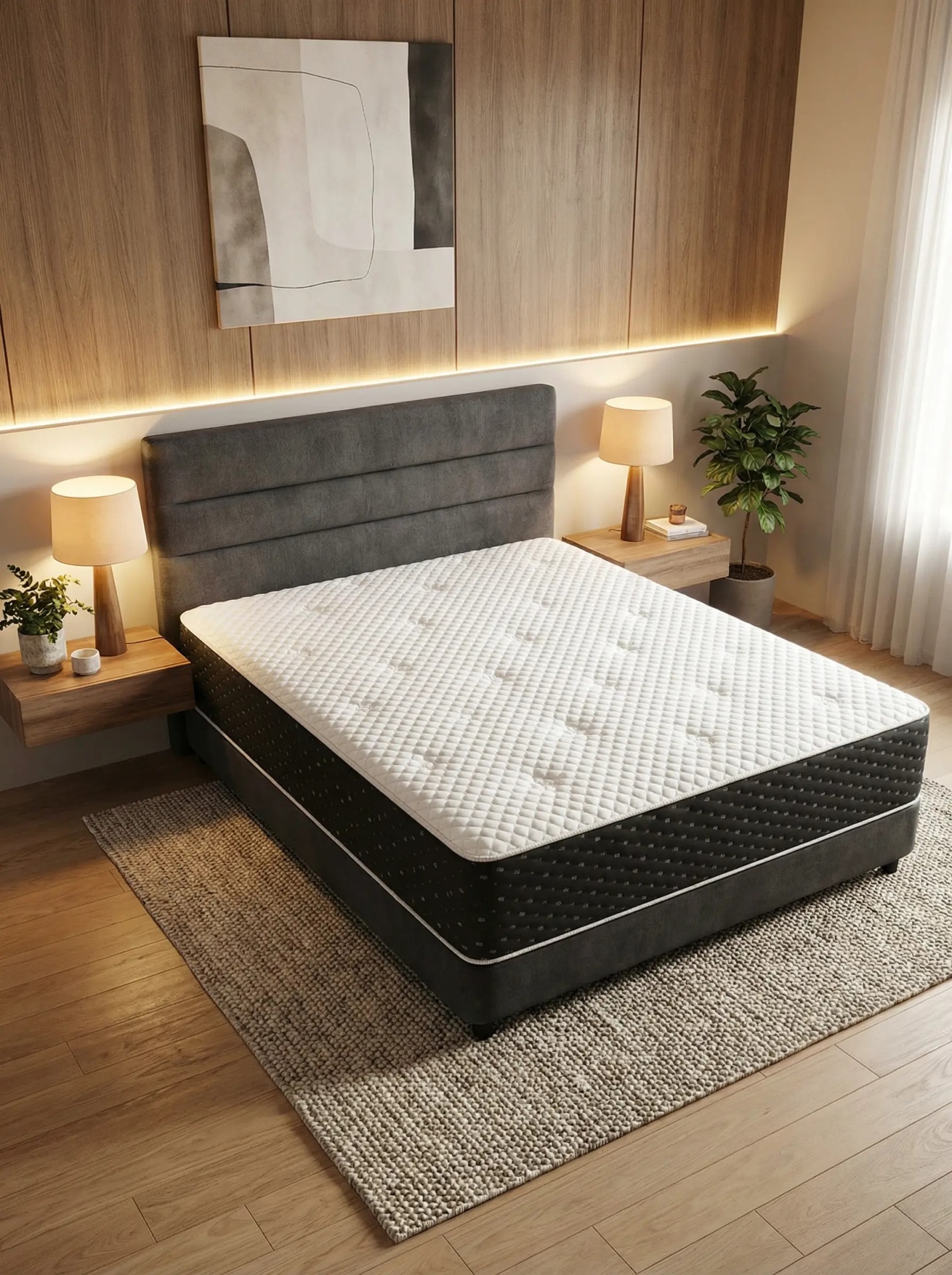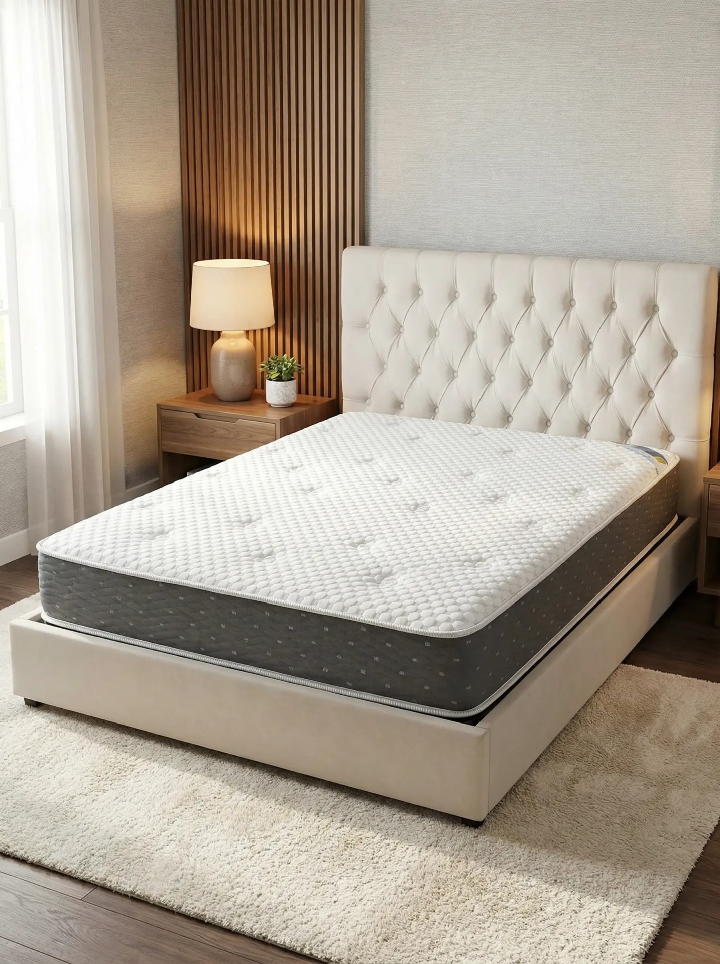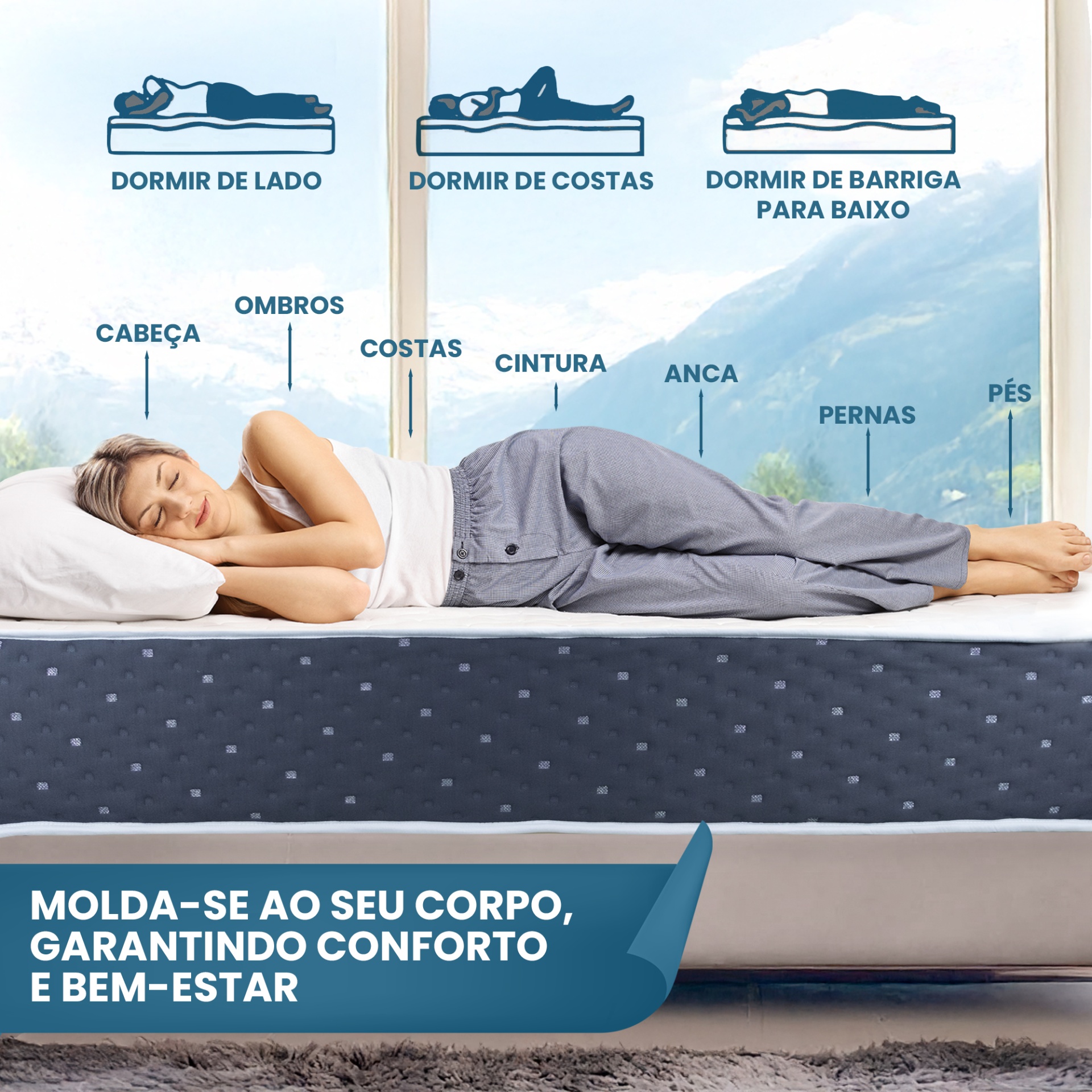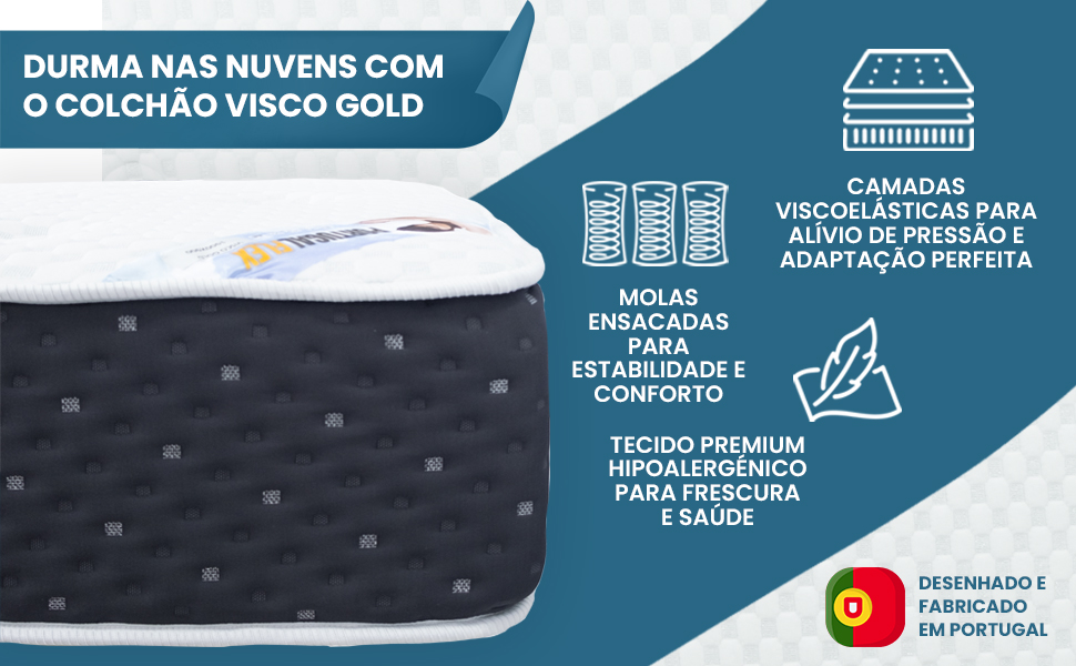 Colchão de molas ensacadas, com revestimento a espuma 30kg, com 2cm viscoelástico de cada lado e 150g de fibra.