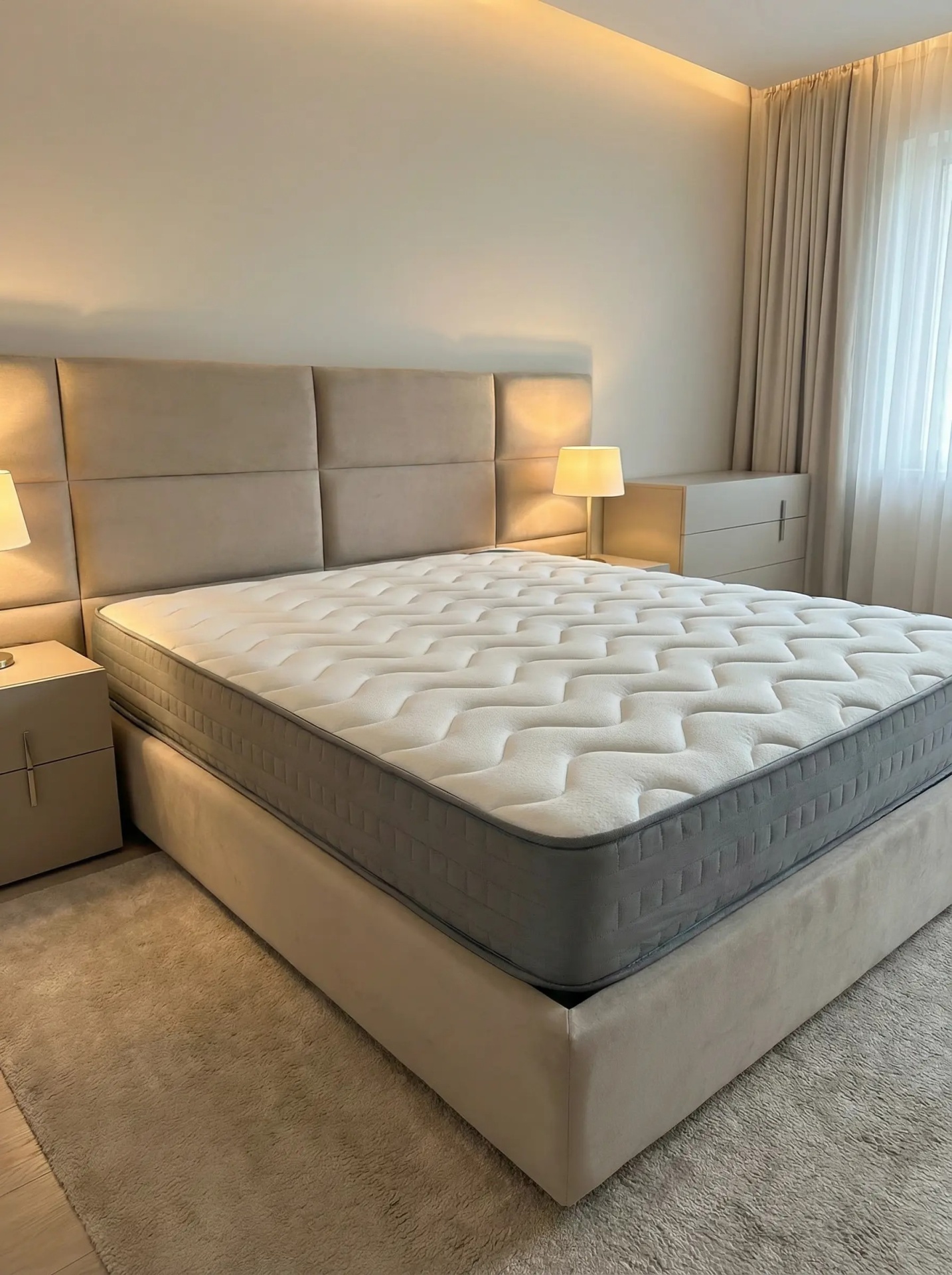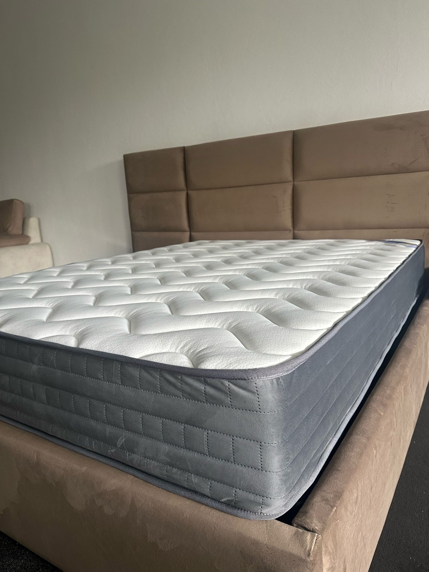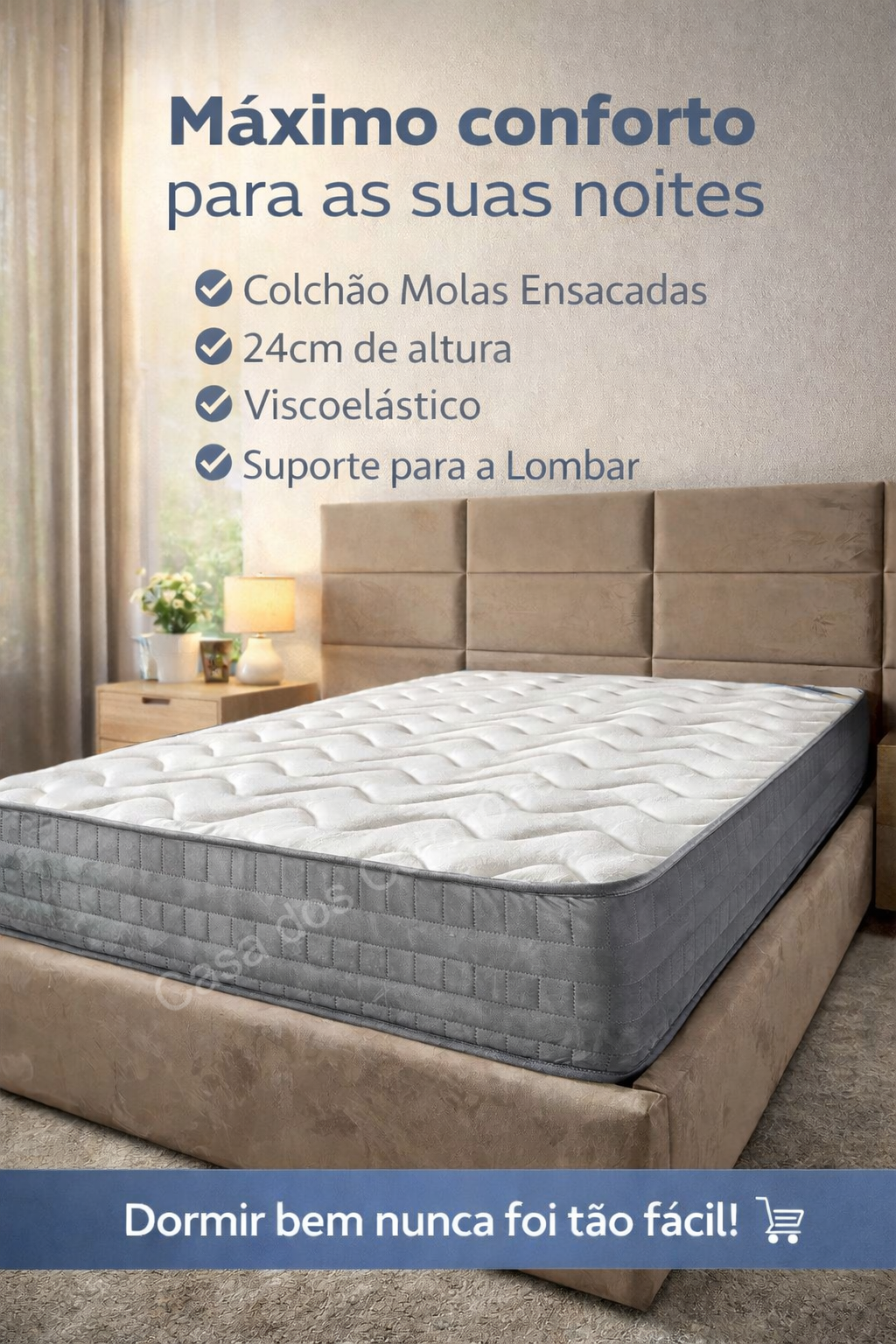 Colchão de molas ensacadas, com revestimento a espuma 30kg, 150g de fibra e viscoelástico.                                                                                                                                               Revestido a tecido Aloevera anti-alérgico. Faixa 3D. Respirável.